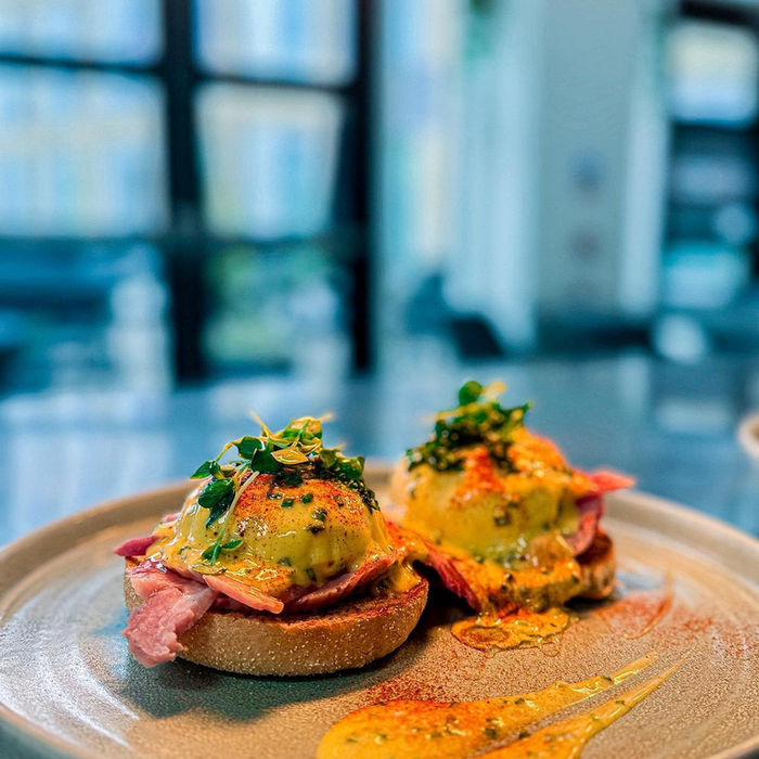 Sourdough topped with smashed avocado, poached eggs, spicy chorizo, and napalm jam, finished with sesame seeds for a fiery kick.Eggs Benny – £12.00